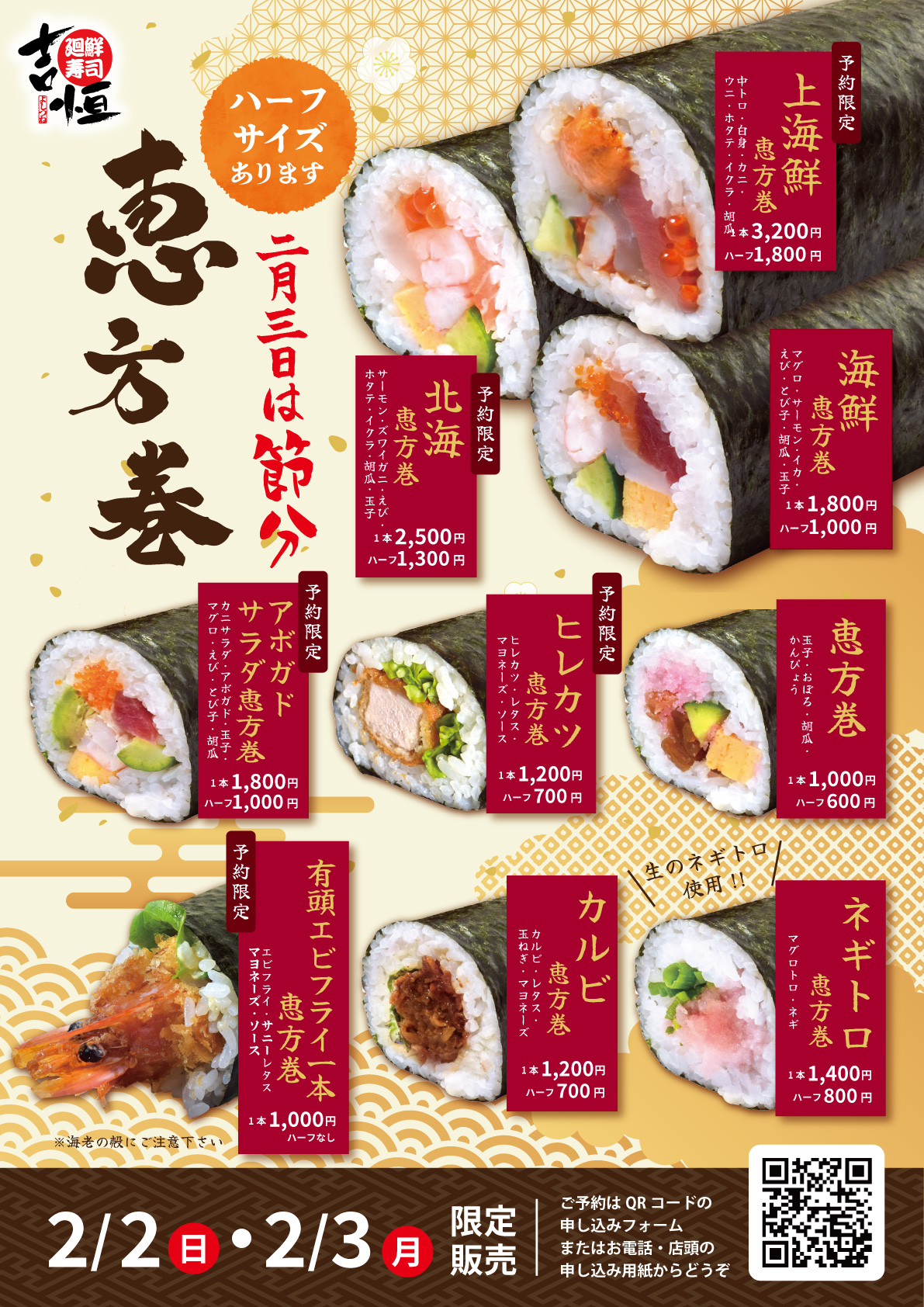 上海鮮恵方巻、北海恵方巻、ヒレカツ恵方巻、アボガドサラダ恵方巻、有頭エビフライ一本恵方巻は、予約販売のみになります。