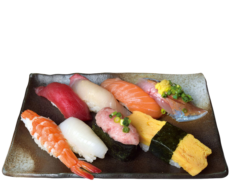 うなぎ、まぐろ、白身、光物、 サーモン、いくら、甘エビ。 茶碗蒸し付き